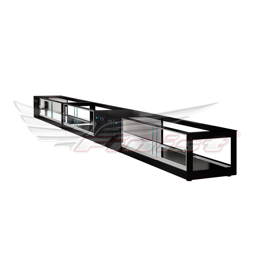 Остекленение с 3 сторон максимально открывает зону демонстрации продукта, что вместе с современным дизайном самой витрины привлекает внимание клиентов. Доступ к продукту максимально облегчен посредством наличия с задней стороны раздвижных прозрачных дверец, которые позволяют легко производить чистку внутри рабочей камеры.