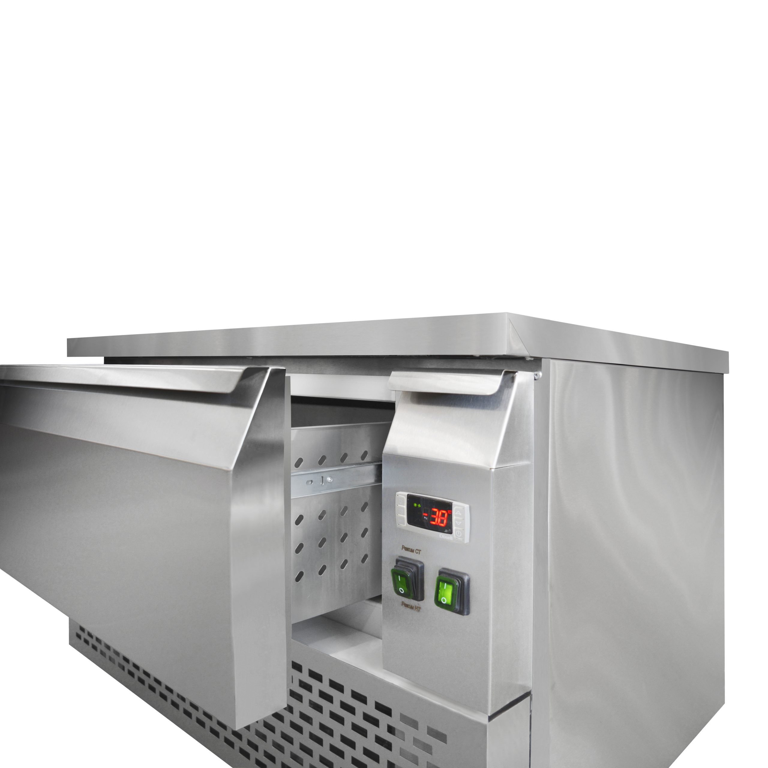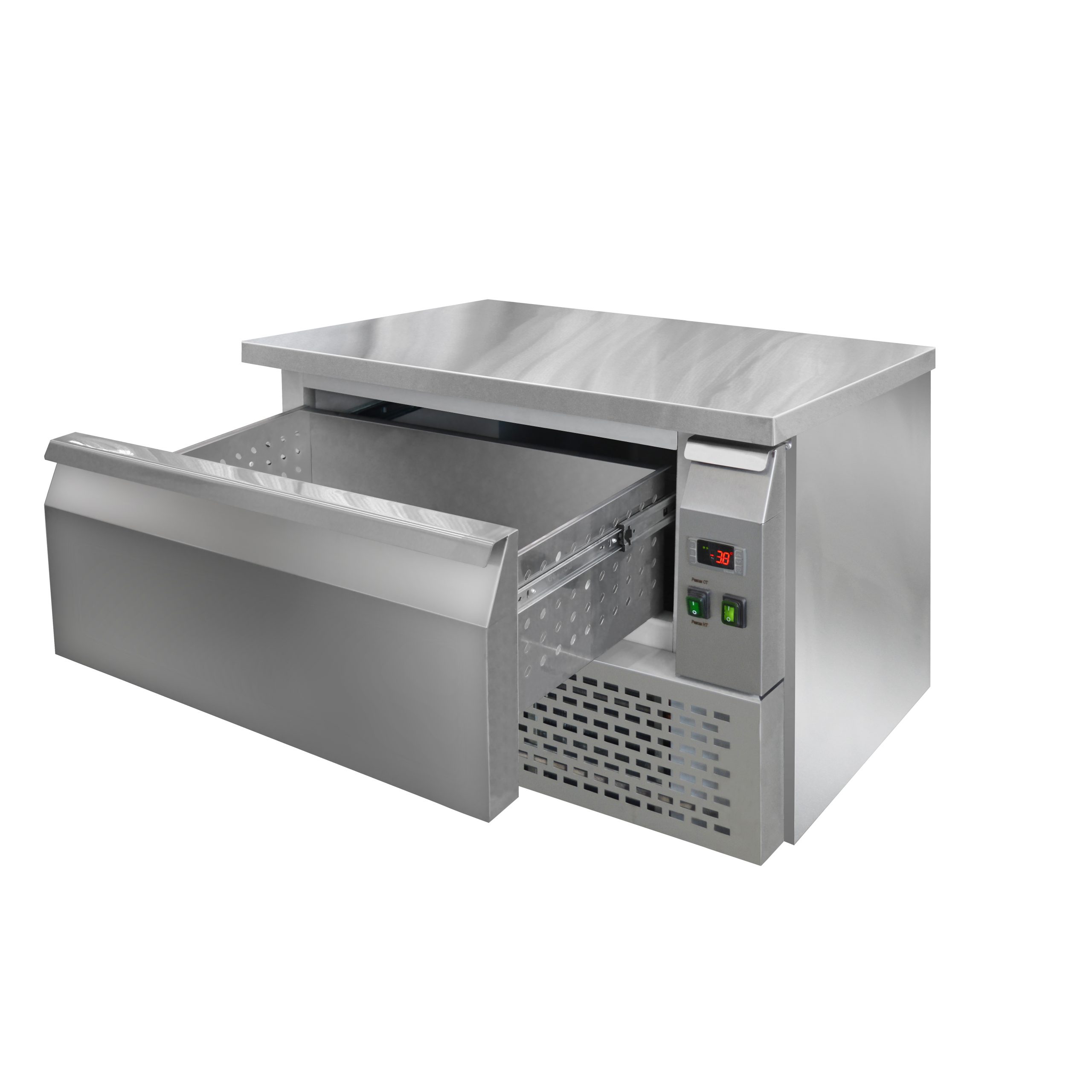 Холодильно-морозильная тумба выполнена из высококачественной пищевой нержавеющей стали. Используется электрический блок управления с функцией автоматической оттайки. Передняя панель моторного отсека имеет большую площадь перфорации, что позволяет обеспечить холодильному агрегату поступление воздуха для охлаждения.