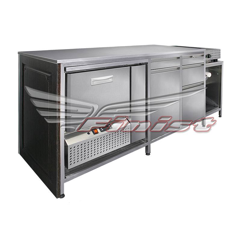 - ниша с холодильным столом для хранения молока, сливок и небольшого запаса десертов. Холодильный стол может быть выполнен с дверями (стандартными или стекло) или ящиками;