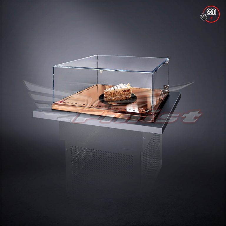 Встраиваемая конструкция позволяет устанавливать витрину в столешницу из любого материала и эргономично использовать место в зале кондитерской. Выкладка продукции осуществляется на дно витрины из золотой/бронзовой нержавеющей стали.