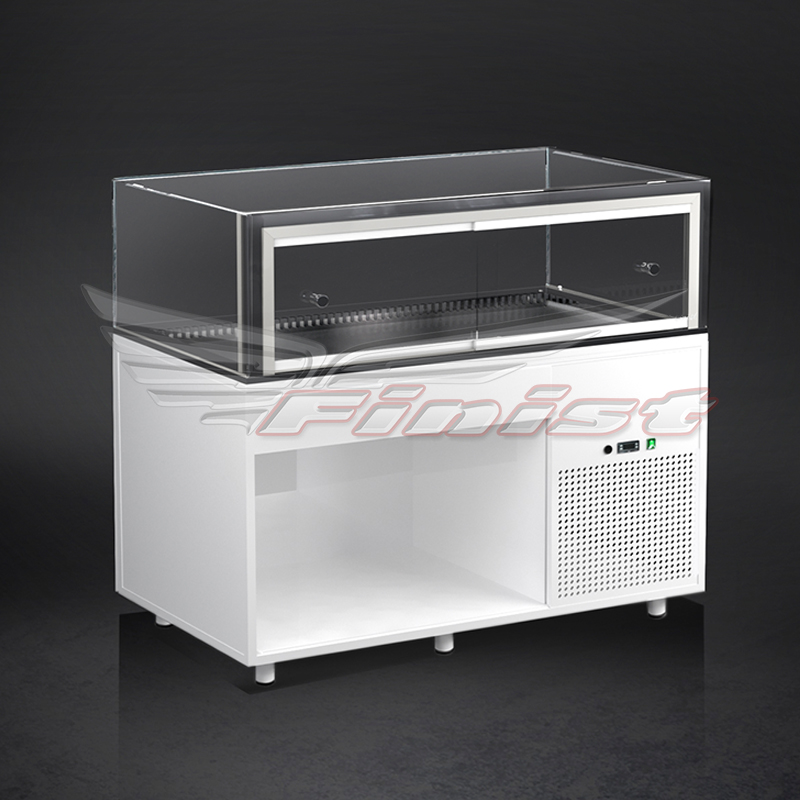 Данный вид витрин предназначен для экспозиции и кратковременного хранения десертов и кондитерских изделий. Выкладка продуктов для демонстрации осуществляется на дно и промежуточную полку витрины. Доступ к продукции осуществляется с помощью раздвижных дверей купе.