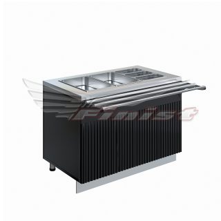 Со стороны повара раздачи в прилавке имеется ниша для хранения запаса посуды или продуктов. Опционально это нишу возможно оснастить распашными дверцами или дверцами типа купе.