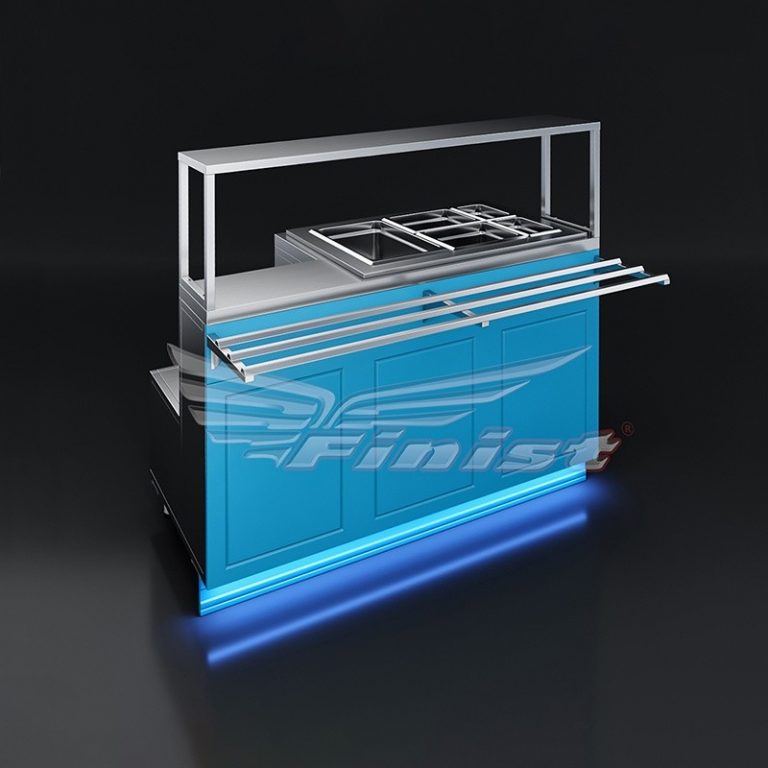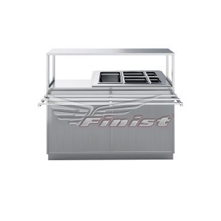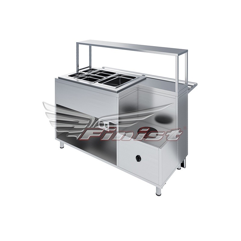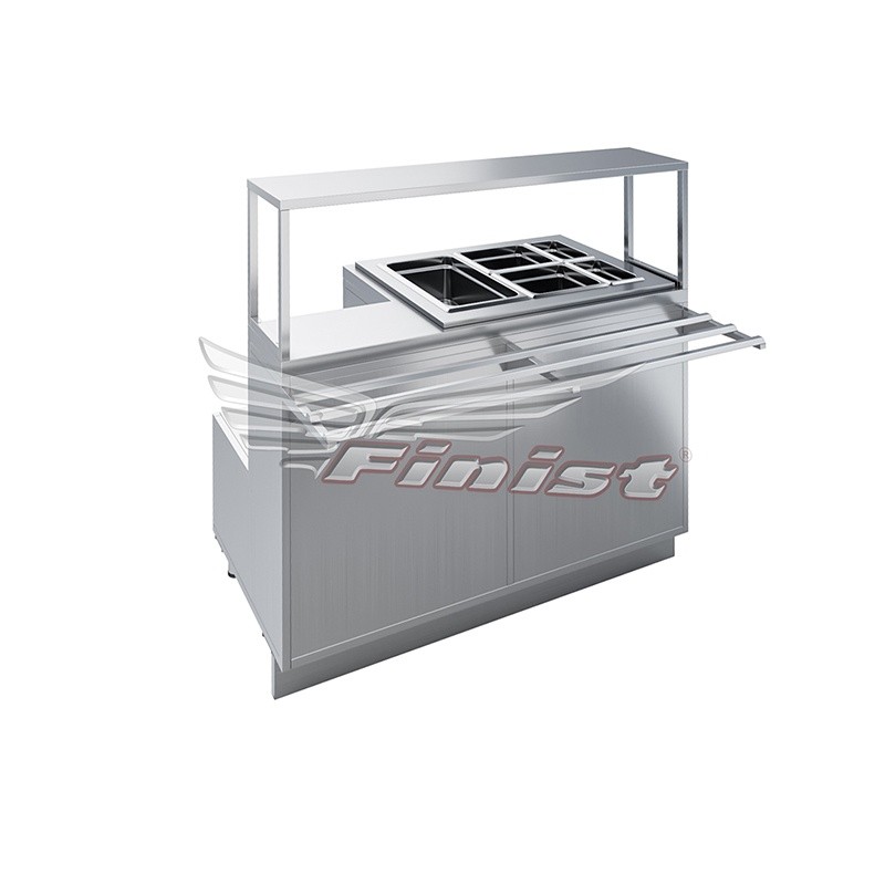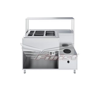 В стандартном исполнении комплектуется одной конфоркой (или поверхностью под одну кастрюлю) и ванной с подогревом для комплекта гастроёмкостей: 1xGN1/1×150, 2xGN1/2×150, 2xGN1/4×150.