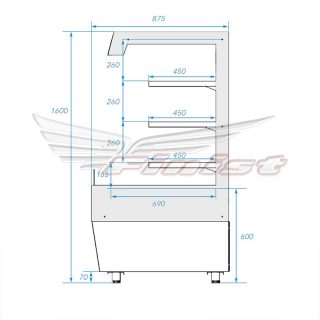 Модель легко впишется в интерьер торгового пространства благодаря тому, что ее можно окрасить в любой цвет по вашему желанию. Боковые панели выполнены из стекла для лучшего обзора продукции. Четыре регулируемые ножки компенсируют неровности пола. Возможно изготовление витрины полностью из нержавеющей стали.