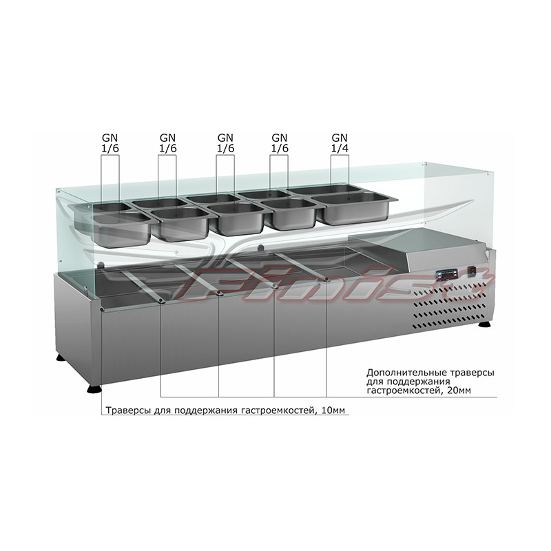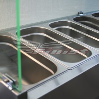 Прибор оснащен статическим охлаждением. Гастроемкости GN1/3 и GN1/2 глубиной 150мм приобретаются отдельно. Холодильная витрина — хорошее дополнение к холодильному столу или блинной станции.