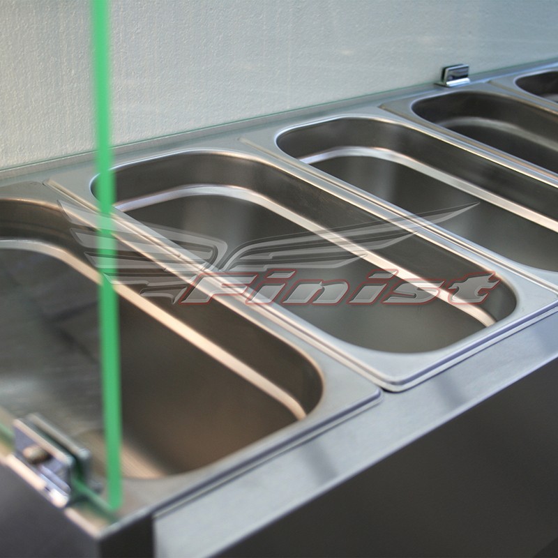 Холодильная настольная витрина ToppingBox с моллированным стекломпредназначена для демонстрации и кратковременного хранения подготовленных начинок/топпингов (для пиццы, блинов, лапши WOK), а также мясных изделий и полуфабрикатов на предприятиях быстрого питания и торговли. Пониженная температура позволяет в течение длительного времени сохранять вкусовые качества, внешний вид иструктуру продуктов. Молированное стекло предотвращает попадание в гастроемкости посторонних предметов и придает изделию стильный дизайн.