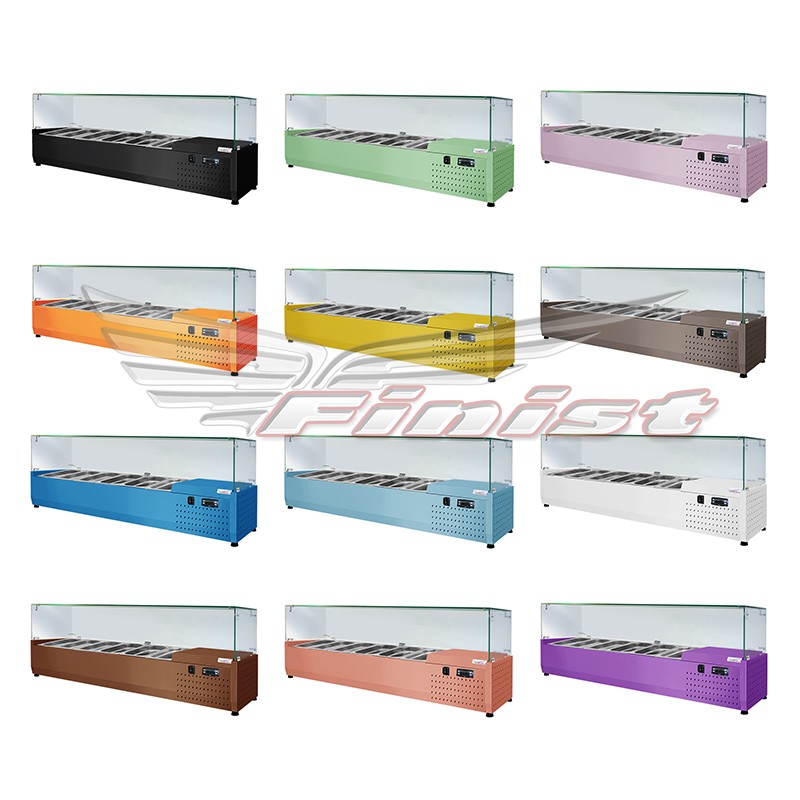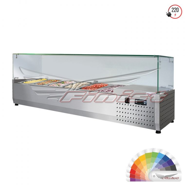 Холодильная настольная витрина ToppingBox с прямоугольным стеклом предназначена для демонстрации и кратковременного хранения подготовленных начинок/топпингов (для пиццы, блинов, лапши WOK), а также мясных изделий и полуфабрикатов на предприятиях быстрого питания и торговли. Пониженная температура позволяет в течение длительного времени сохранять вкусовые качества, внешний вид иструктуру продуктов. Стеклянный купол предотвращает попадание в гастроемкости посторонних предметов.