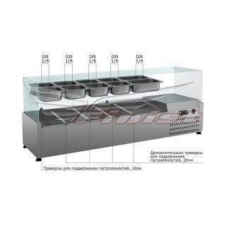 | Настольная холодильная витрина (со стеклом прямоугольным) | НХВсп-10 GN1/4 | 2000х330х510 | 10шт GN 1/4-150 | 40 |