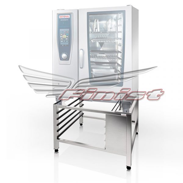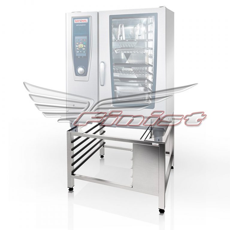 Подставка предназначена специально для установки пароконвектоматов Rational серии SELFCOOKINGCENTER и COMBI MASTER 101. Пароконвектомат устанавливается на винты M4, что предотвращает опрокидывание техники и обеспечивает комфортные условия труда. Каркас сварной полностью выполнен из профильной нержавеющей трубы и оснащен регулируемыми по высоте опорами. Подставка оснащена 5 уровнями направляющих для хранения гастроемкостей GN 1/1.