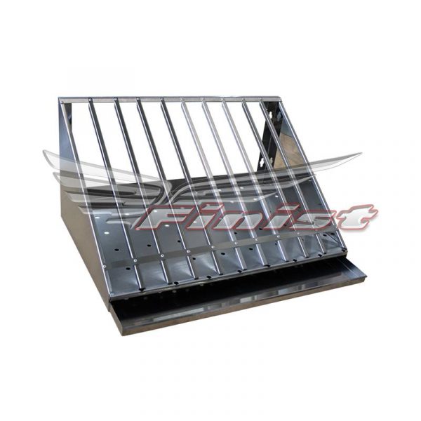 Полки имеют ячейки с разделителями для сушки и хранения крышек. Конструкция изделия позволяет использовать ее как в навесном, так и в настольном варианте. Полка изготовлена полностью из нержавеющей стали. Дно полки имеет отверстия для стока воды в выдвижной поддон для её сбора.