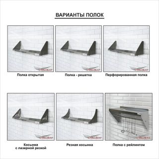 Полки полностью изготовлены из шлифованной нержавеющей стали. Конструкция полки позволяет подвешивать ее на стену.