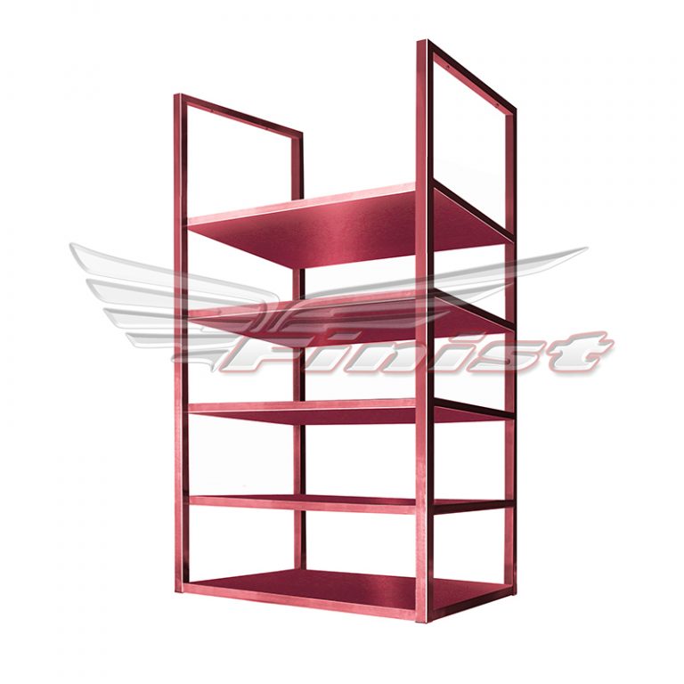 Каркас цельносварной из крашенной стали по палитре RAL (труба 25х25 мм). Имеется два типа крепления к потолку. Возможна индивидуальная подсветка для каждой полки.