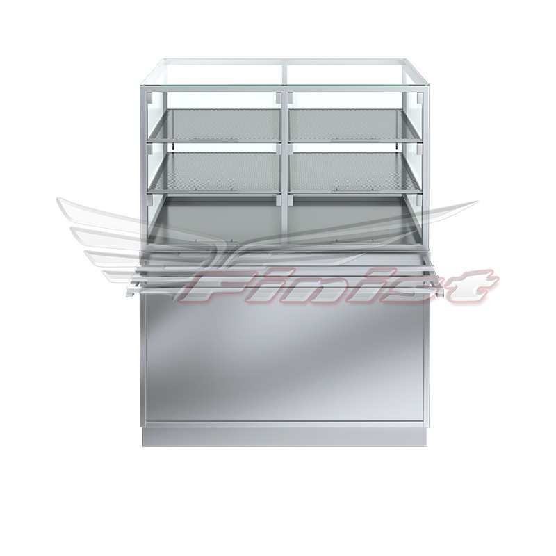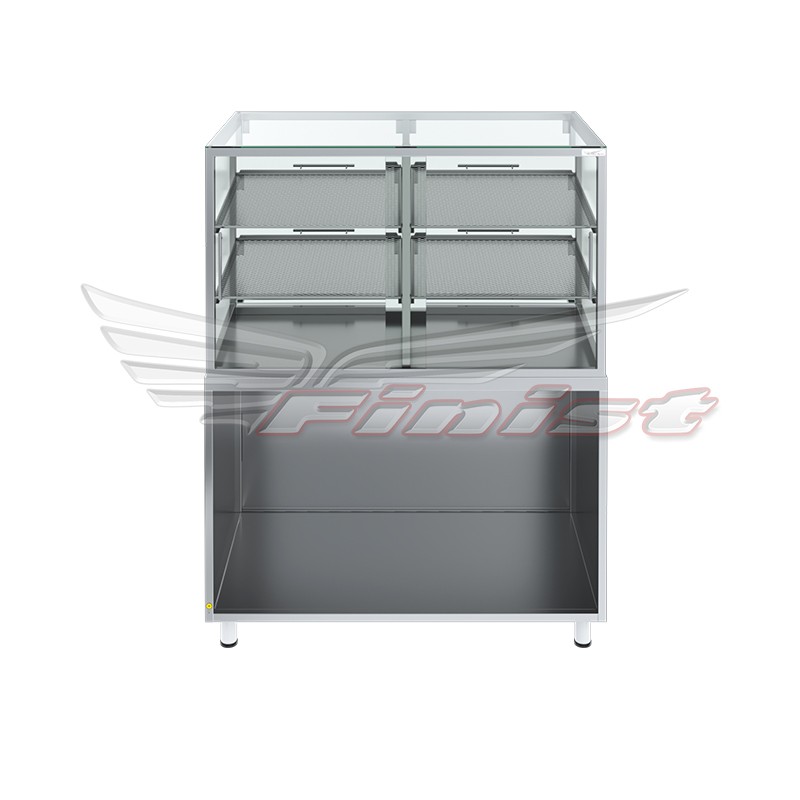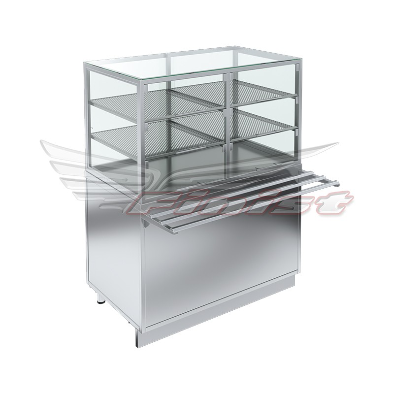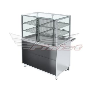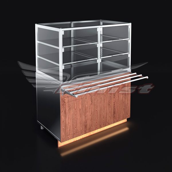 Витрина оснащена двумя рядами полок-решёток. Во внутреннем объёме установлена светодиодная подсветка.