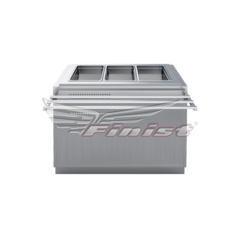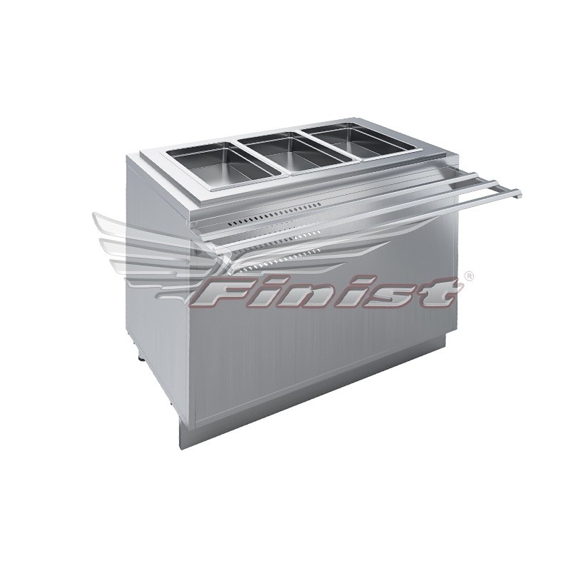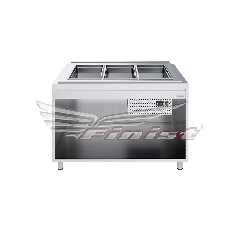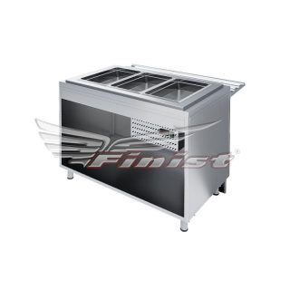 Продукт хранится в гастроёмкостях, расположенных в охлаждаемой ванне. Габариты прилавка рассчитаны под использование гастроёмкости GN 1/1-150 мм (в комплект поставки не входят). При использовании дополнительных перемычек возможно устанавливать в прилавок гастроёмкости меньшего формата.
