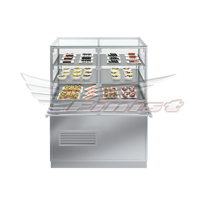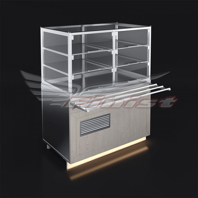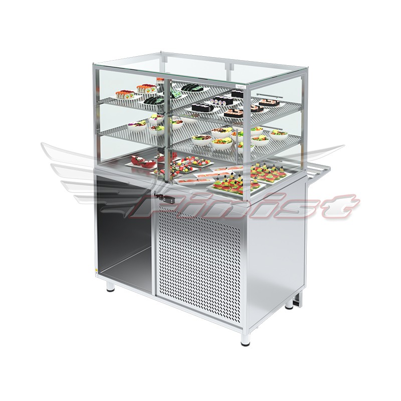 Витрина имеет остекление со всех четырёх сторон — это обеспечивает великолепный обзор, выставленных в ней продуктов. Со стороны повара раздачи она снабжена двумя дверцами типа купе для свободного пополнения блюд экспозиции. Со стороны гостя имеется шесть откидных дверок с самозакрывающимся механизмом, позволяющих легко достать заинтересовавшее блюдо.