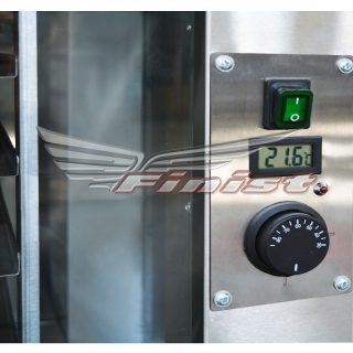 Расстоечный шкаф – это, прежде всего, шкаф из нержавеющей стали. Мы не стали делать тайны из того, что происходит внутри, и оборудовали расстойку стеклянными дверцами. Через них удобно визуально контролировать процесс, не открывая шкаф и не создавая сквозняки. При изменении объёма на поверхности изделий из теста могут образовываться трещины и разрывы. Чтобы исключить подобные неприятности в расстоечном шкафу поддерживается высокая влажность. Пароувлажнение происходит за счёт испарения влаги из специальной ёмкости на дне шкафа, подогреваемой электрическими ТЭНами. Температура внутри шкафа при этом должна быть от 33 до 45°С. Представленный в данной модели более широкий температурный диапазон +30…80°С позволит быстро нагреть шкаф для скорейшего начала работы.