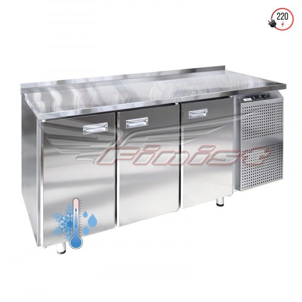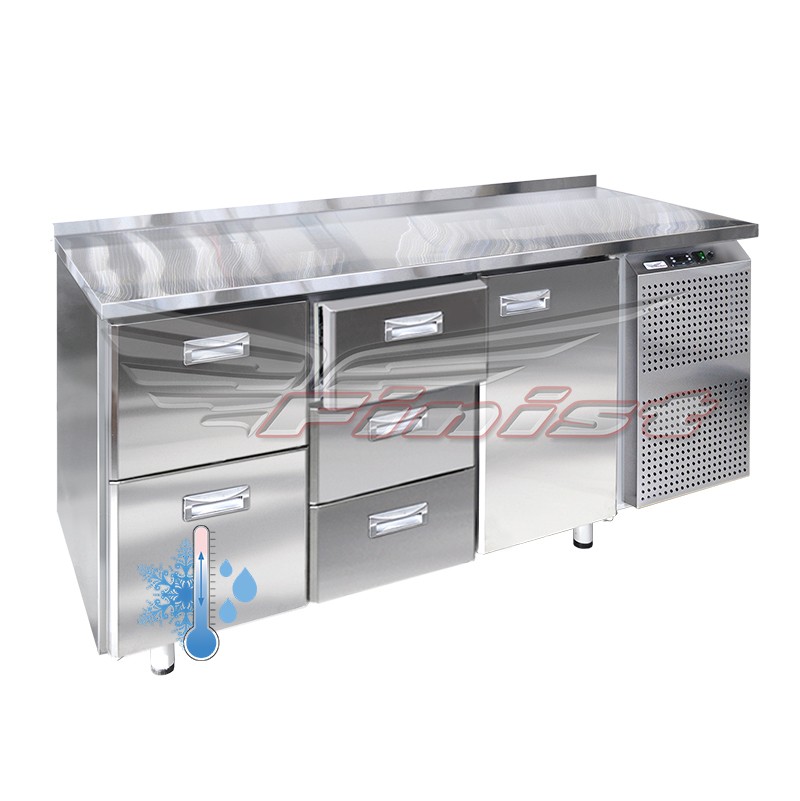 Холодильный стол выполнен из высококачественной пищевой нержавеющей стали. Столы могут производиться (выпускаться) с распашными дверями (ящиками), которые имеют надежные петли (для ящиков направляющие) с опцией доводчиков, что обеспечивает гарантированное закрытие и поддержание заданной температуры в рабочем объеме стола. Используется электрический блок управления с функцией автоматической оттайки. Передняя панель моторного отсека имеет большую площадь перфорации, что позволяет обеспечить холодильному агрегату поступление воздуха для охлаждения.