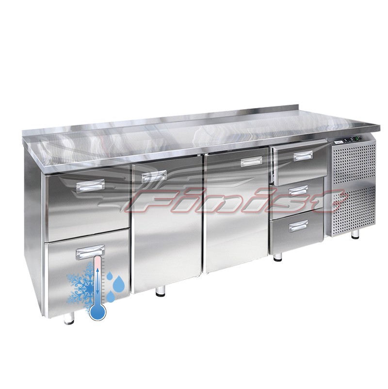 Холодильный стол выполнен из высококачественной пищевой нержавеющей стали. Столы могут производиться (выпускаться) с распашными дверями (ящиками), которые имеют надежные петли (для ящиков направляющие) с опцией доводчиков, что обеспечивает гарантированное закрытие и поддержание заданной температуры в рабочем объеме стола. Используется электрический блок управления с функцией автоматической оттайки. Передняя панель моторного отсека имеет большую площадь перфорации, что позволяет обеспечить холодильному агрегату поступление воздуха для охлаждения.