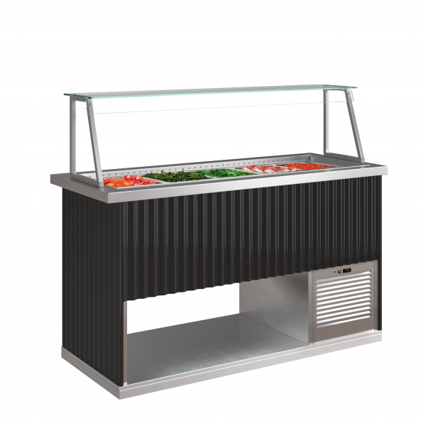 Салат-бар легко впишется в интерьер вашего пространства благодаря фасадам, которые могут быть обшиты любым МДФ по вашему желанию (в стандартной комплектации покрытие черным цветом с дизайном «Сидней»).