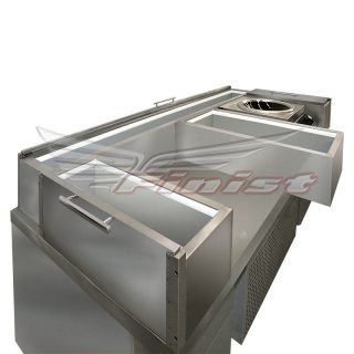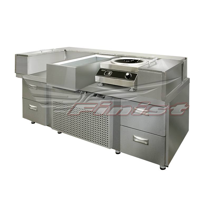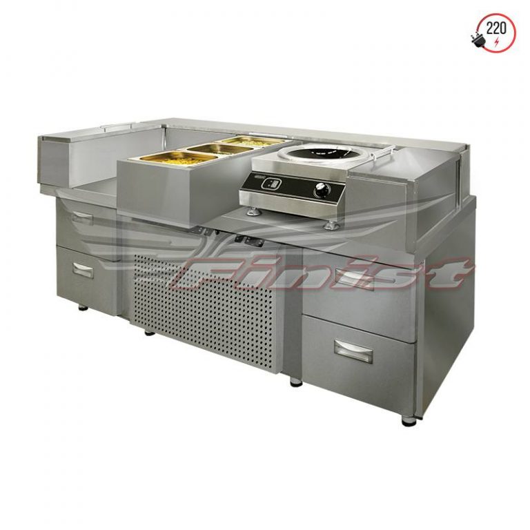 Данный холодильный стол с лёгкостью выполняет роль рабочей станции по приготовлению блюд на плитах WOK. Модуль рассчитан на работу двух поваров одновременно. Для каждого из них образовано удобное рабочее место. В стандартную комплектацию изделия входят: