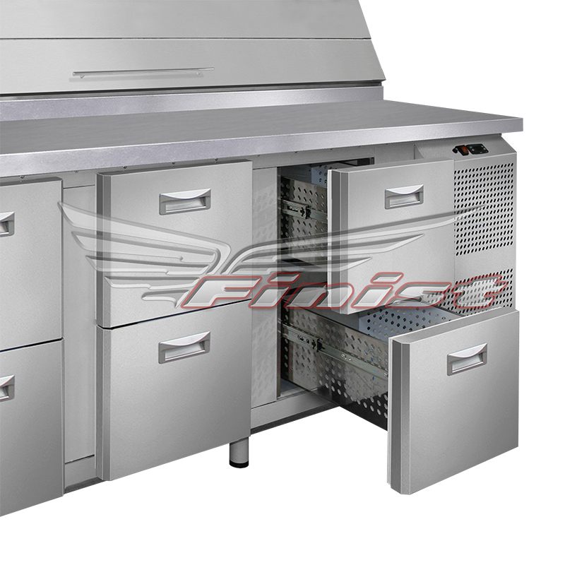 Дополнительно станцию возможно оснастить различными опциями: съёмными карманами с магнитными держателями для хранения листов нори, колёсами для лёгкой уборки, дополнительными холодильными столами большей вместимости.