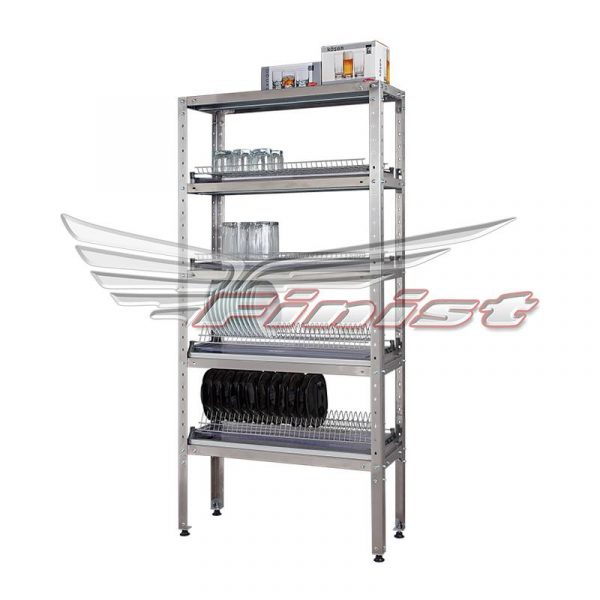 Стеллаж предназначен для использования в технологических помещениях предприятий общественного питания для сушки кухонной посуды и инвентаря. Полки выполнены из пищевой нержавеющей стали. Каркас стеллажа разборный. Стеллажи имеют 5 полок, две из которых предназначены для сушки тарелок, а две для сушки стаканов.