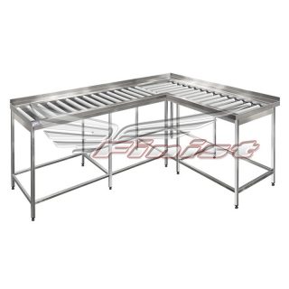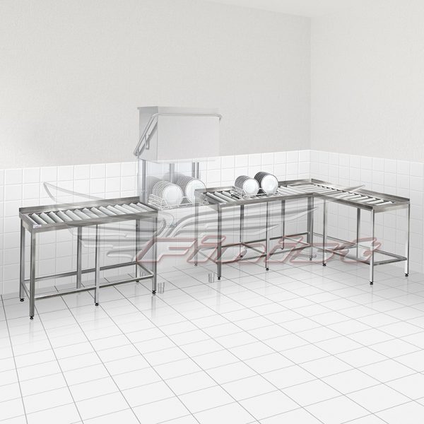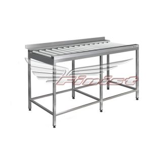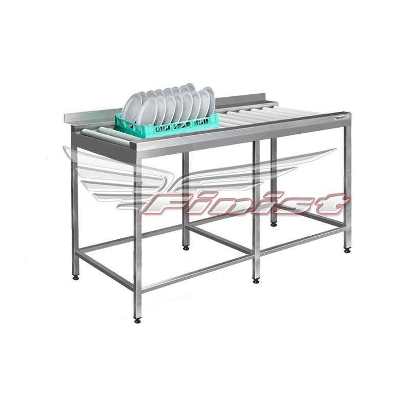 Выполнен полностью из импортной нержавеющей стали. Каркас сварной из профильной трубы. Столешница стола оснащена направляющими с цилиндрическими полипропиленовыми роликами для легкого скольжения по ним кассет с чистой посудой.