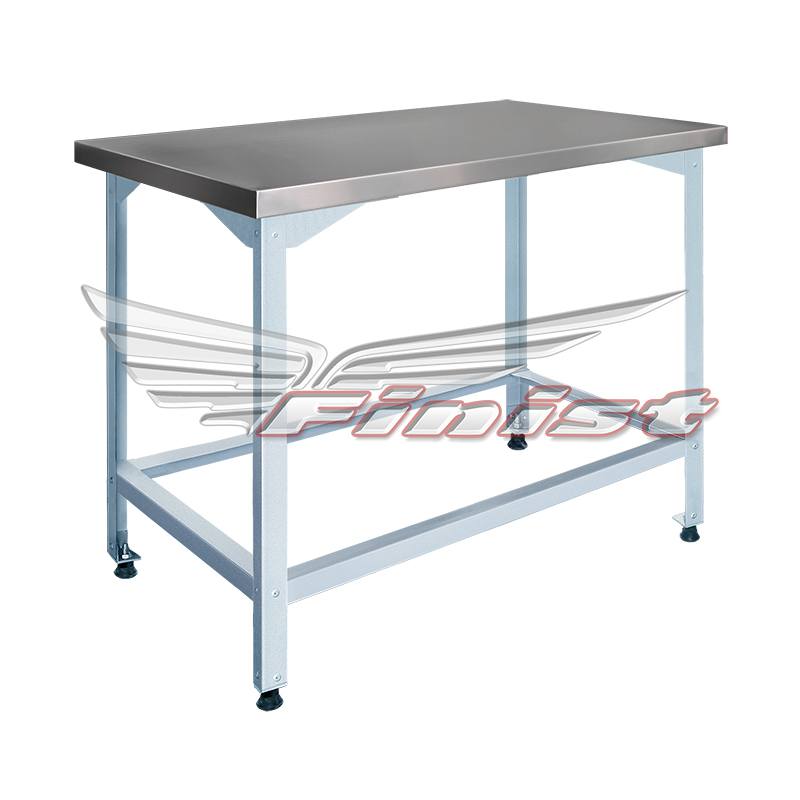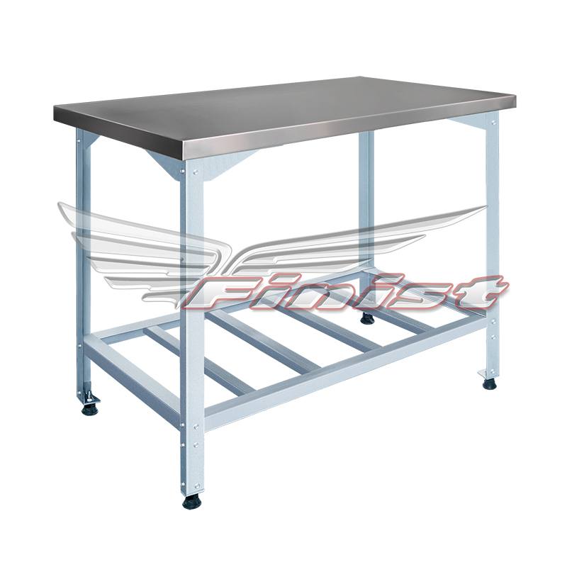 Столы производственные состоят из столешницы — толщиной 35 мм из шлифованной нержавеющей стали. Столы могут поставляться со следующими вариантами полок: сплошная, перфорированная и «решетка».