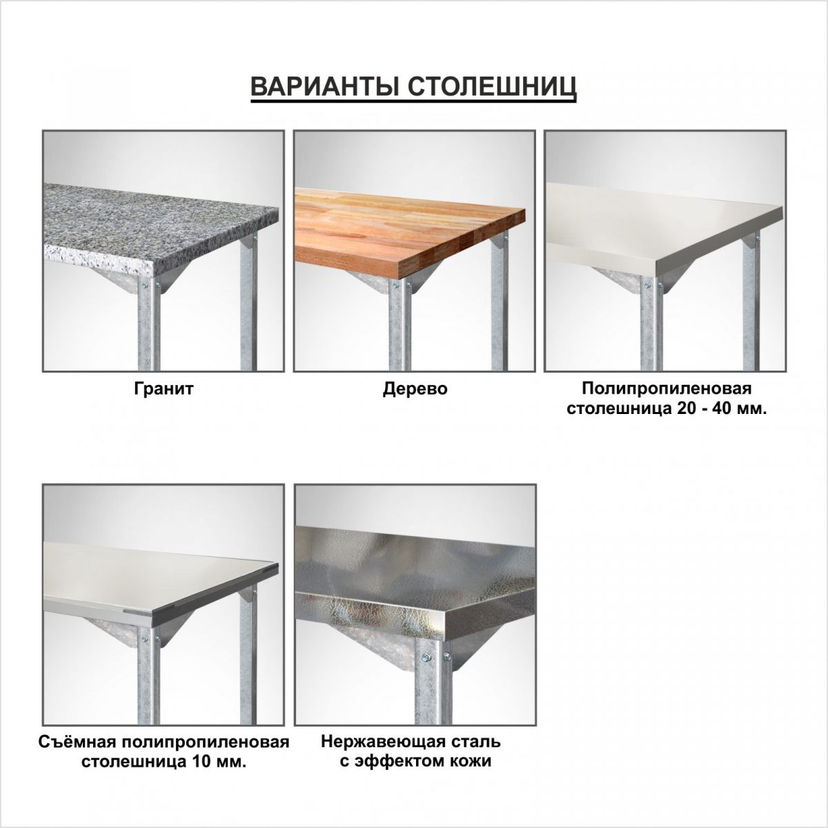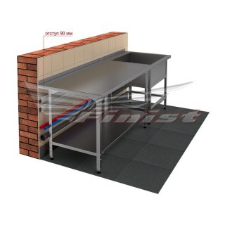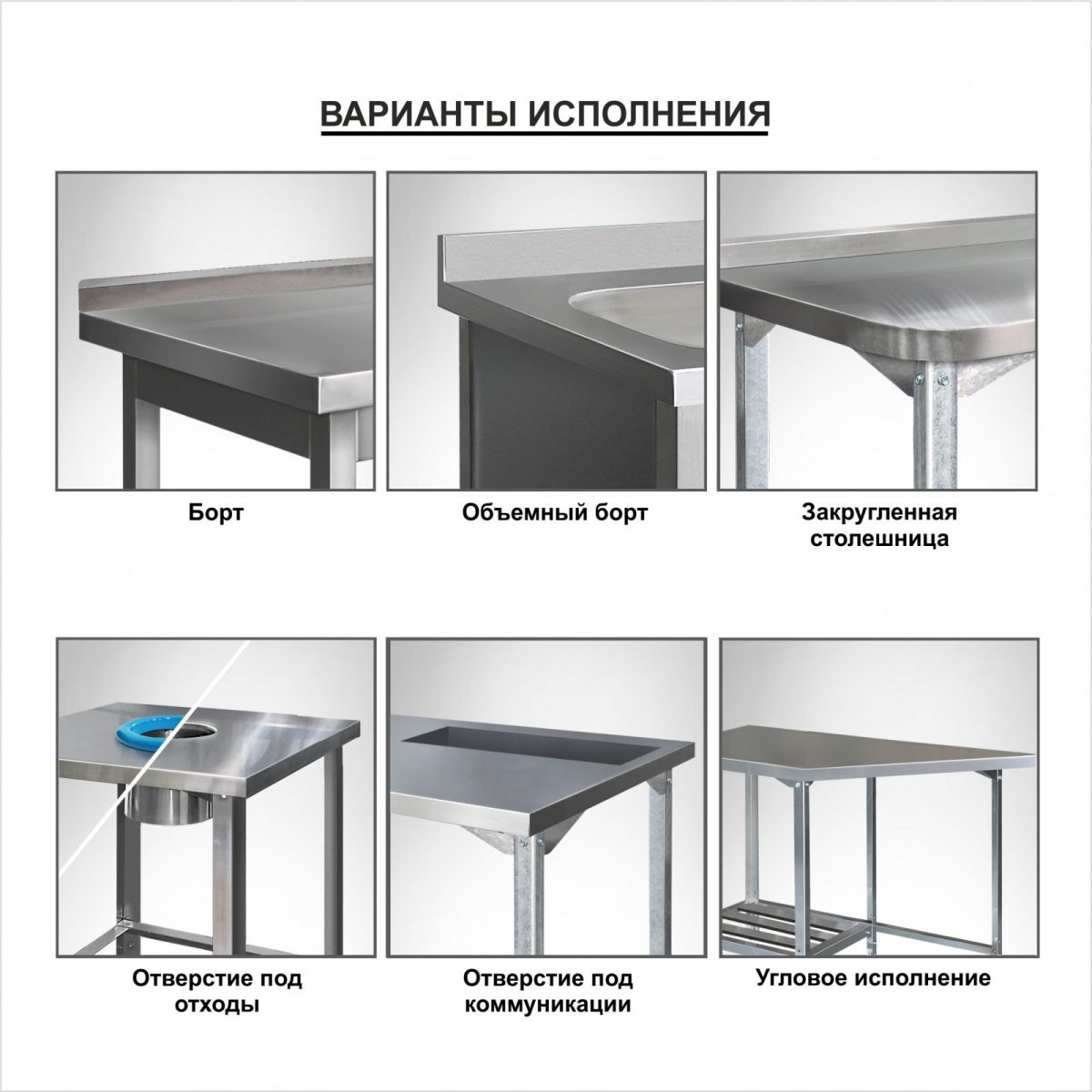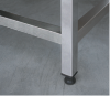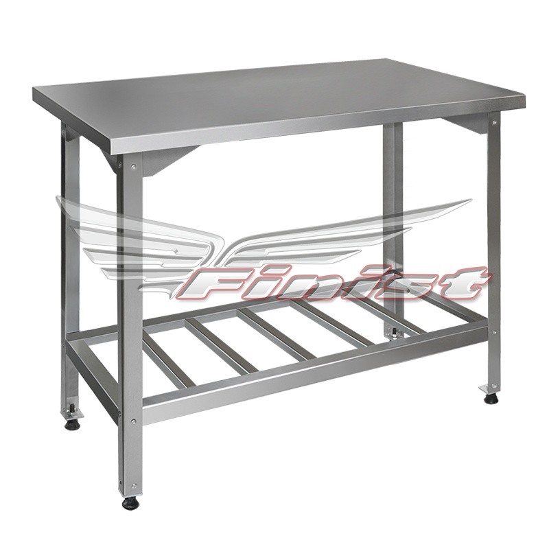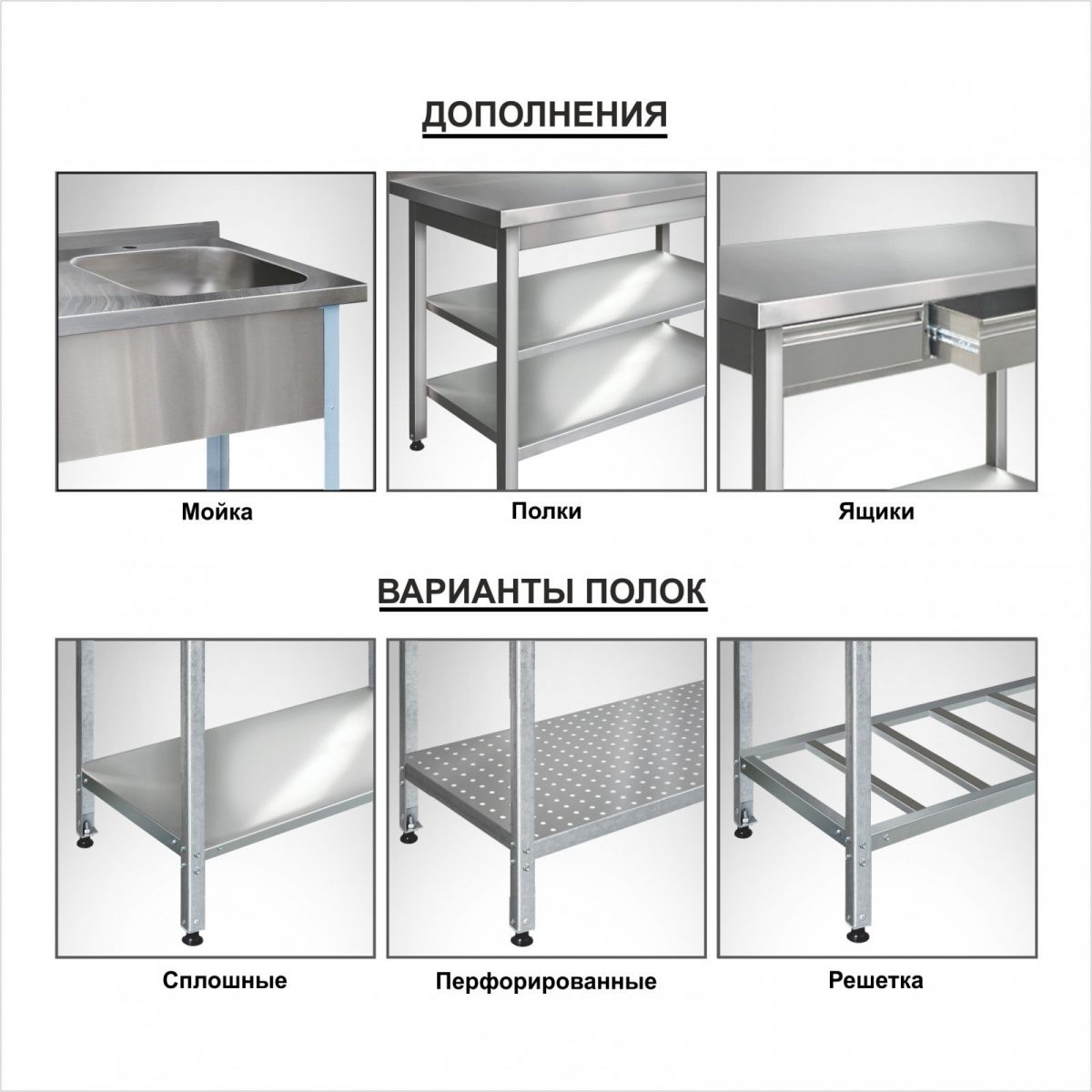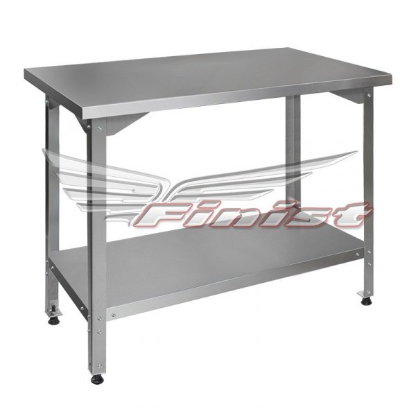 Столы производственные состоят из столешницы — толщиной 35 мм из шлифованной нержавеющей стали. Столы могут поставляться со следующими вариантами полок: сплошная, перфорированная и «решетка».