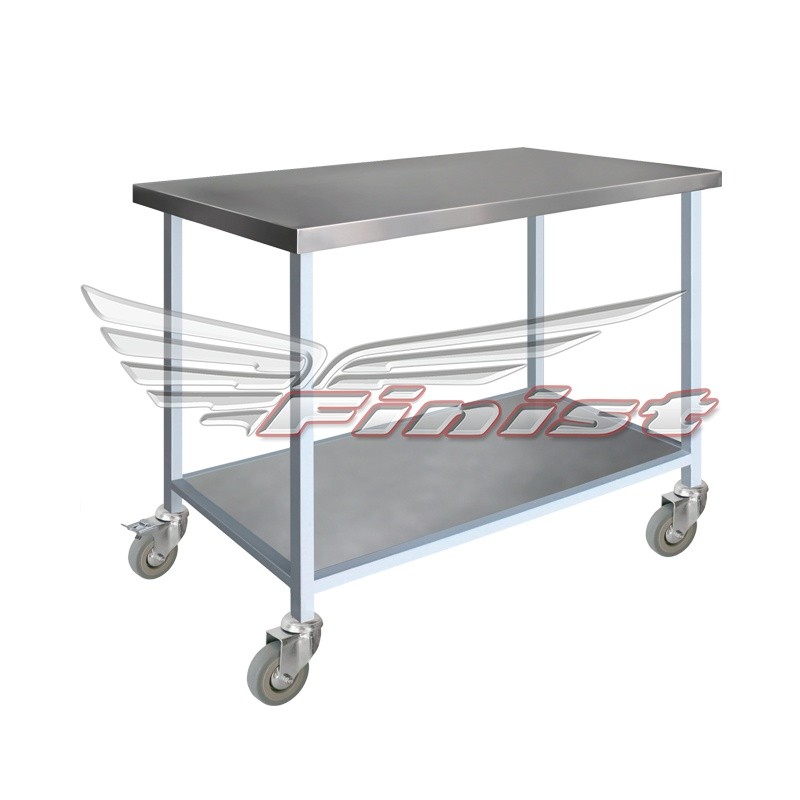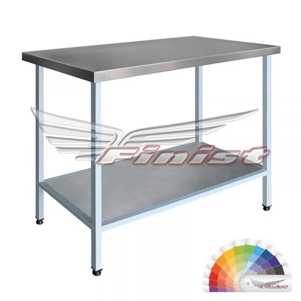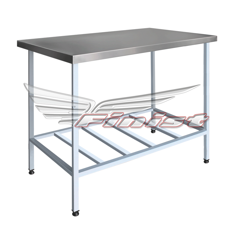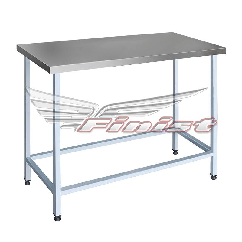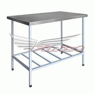 Столы производственные состоят из столешницы — толщиной 35 мм из шлифованной нержавеющей стали. Столы могут поставляться со следующими вариантами полок: сплошная, перфорированная и «решетка».