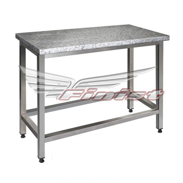 Столешница изготовлена из натурального гранита толщиной 30 мм. Каркас стола сварной, оснащен регулируемыми опорами для компенсации неровностей пола. Поставляются упакованными, в собранном виде.