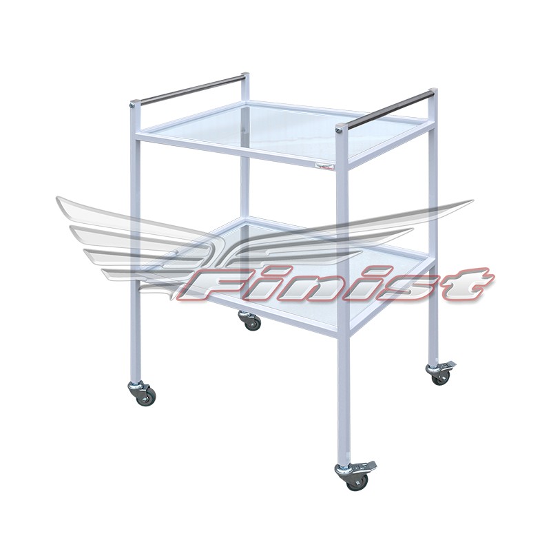 Имеет 2 стеклянные полки (5 мм), конструкция сварная из стали с полимерно-порошковым покрытием. Комплектуется 4 колесами Ø 50 мм, два из которых имеют тормозное устройство.