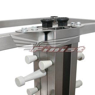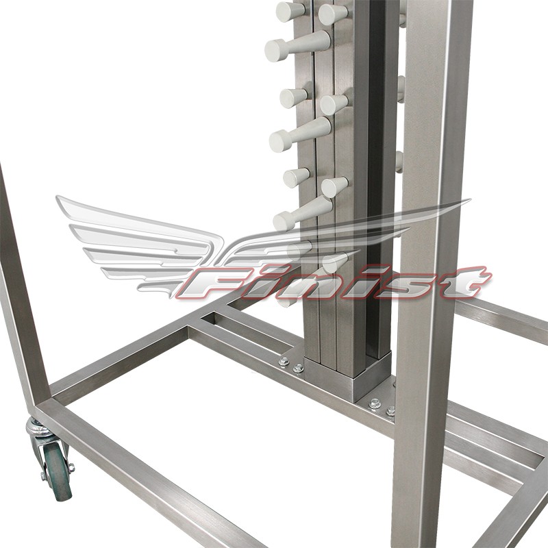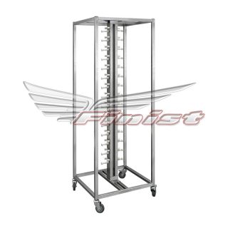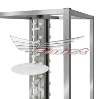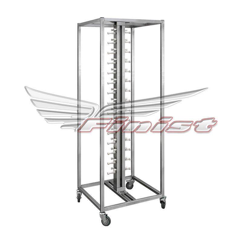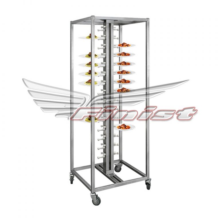 Каркас выполнен из нержавеющей профильной трубы. Передвижение осуществляется на четырех поворотных колесах, диаметром 100 мм, два из которых имеют тормозной механизм. Держатели выполнены из … материала. Максимальная нагрузка на одну пару держателей — 1 кг. Расстояние между тарелками — 80 мм.
