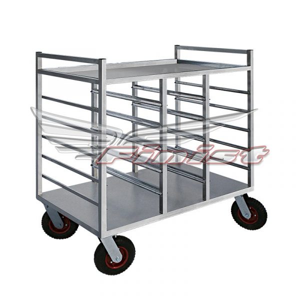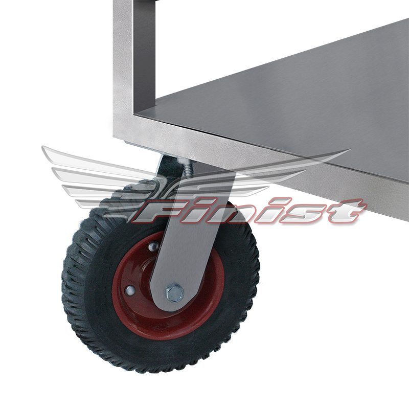Тележка имеет прочный сварной каркас, выполненный полностью из нержавеющей стали. Оснащена увеличенными мягкими колёсами, позволяющими с лёгкостью перемещать тележку в том числе и по улице. При передвижении внутри помещения колёса бережно относятся к напольной плитке, предотвращая её повреждение.