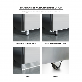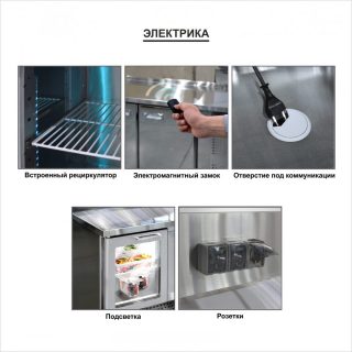 Холодильный стол выполнен из высококачественной пищевой нержавеющей стали. Столы могут производиться с распашными дверями/ящиками, которые имеют надежные петли (для ящиков направляющие) с опцией доводчиков, что обеспечивает гарантированное закрытие и поддержание заданной температуры в рабочем объеме стола.