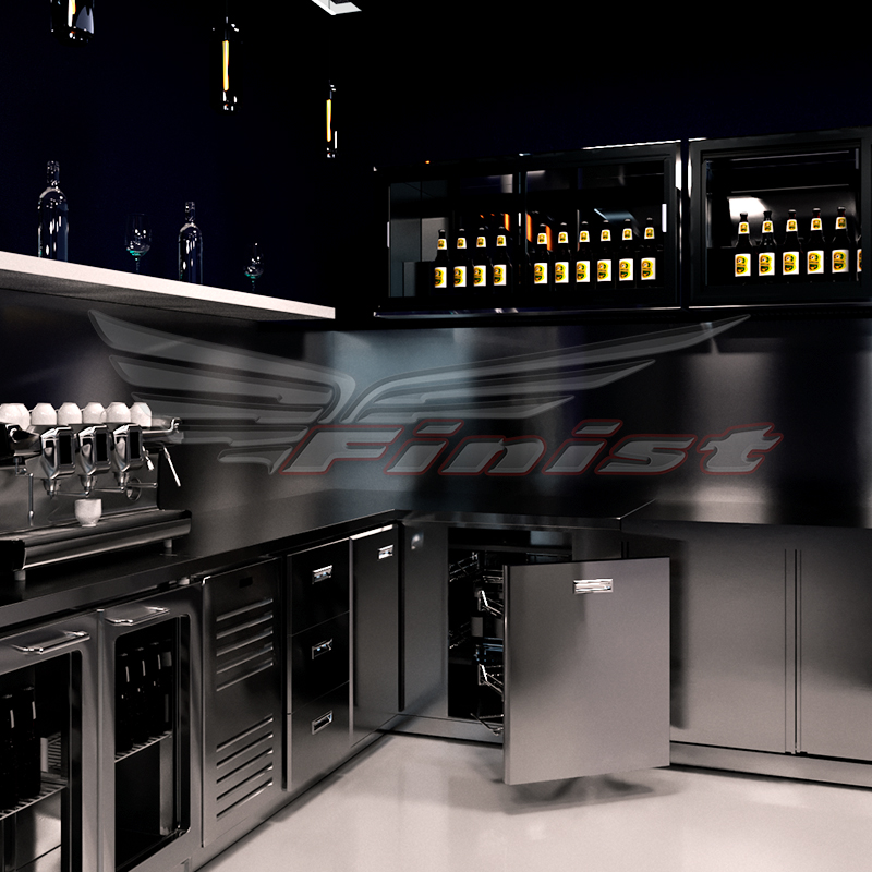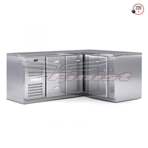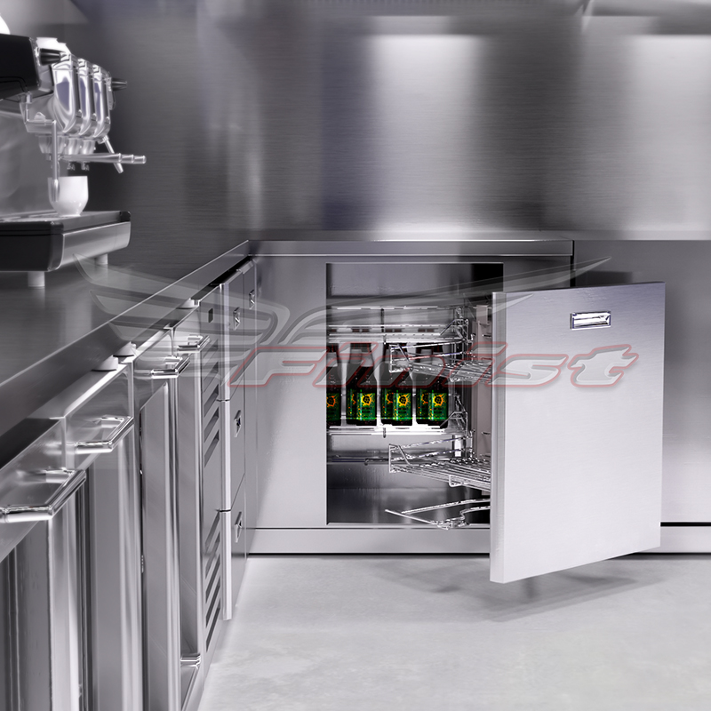 В угловом холодильном столе эффективно используется весь объем. За счёт специальной системы выдвижения теперь легко доставать предметы, которые хранятся в самых труднодоступных местах холодильного стола.