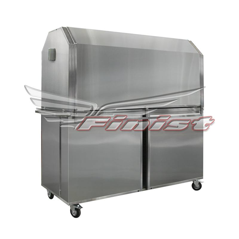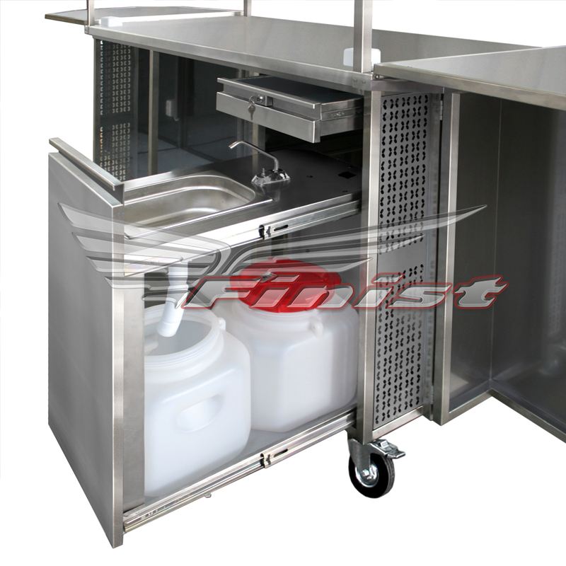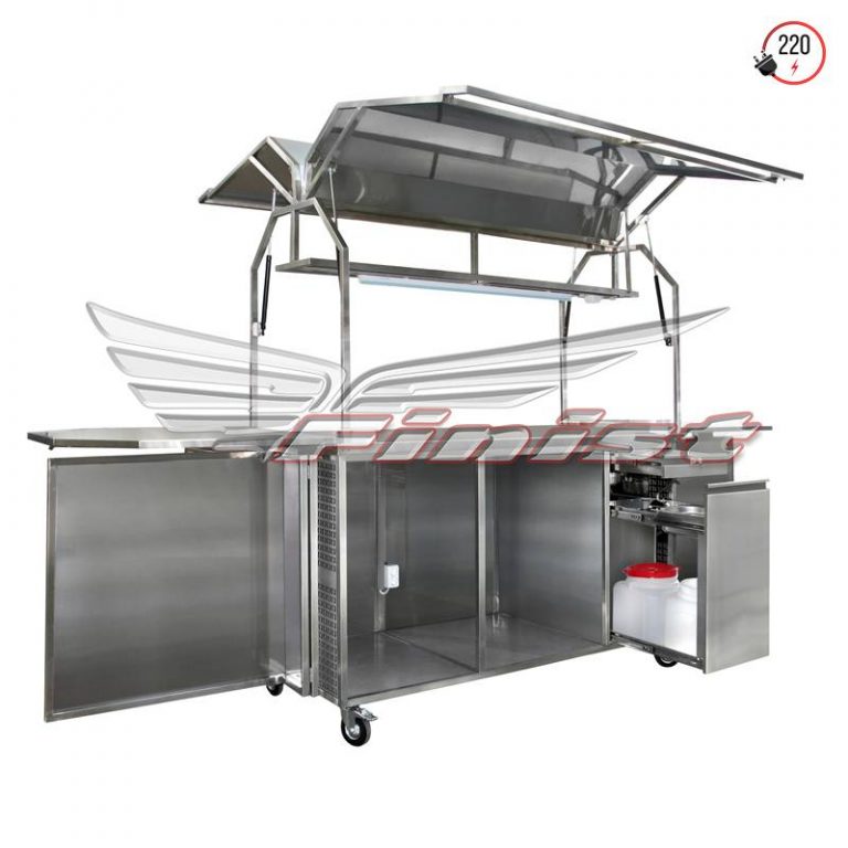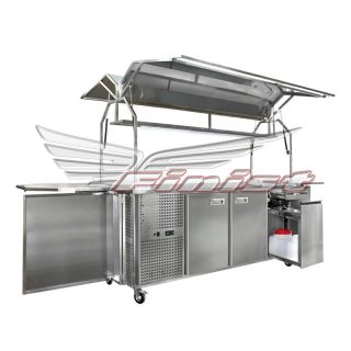 Антивандальное исполнение защищает оборудование и продукцию внерабочее время. Конструкция располагается на четырех колесных опорах, что обеспечивает максимальную мобильность вашей торговой точки. Рабочая поверхность хорошо освещена за счет светодиодных лент над столешницей. Так же над рабочей панелью находится полка, для увеличения площади полезной выкладки. В шкаф под столешницей можно установить любое оборудование, необходимое именно вам. Например, холодильный шкаф. Так же предусмотрено подключение к электросети и водоснабжению.