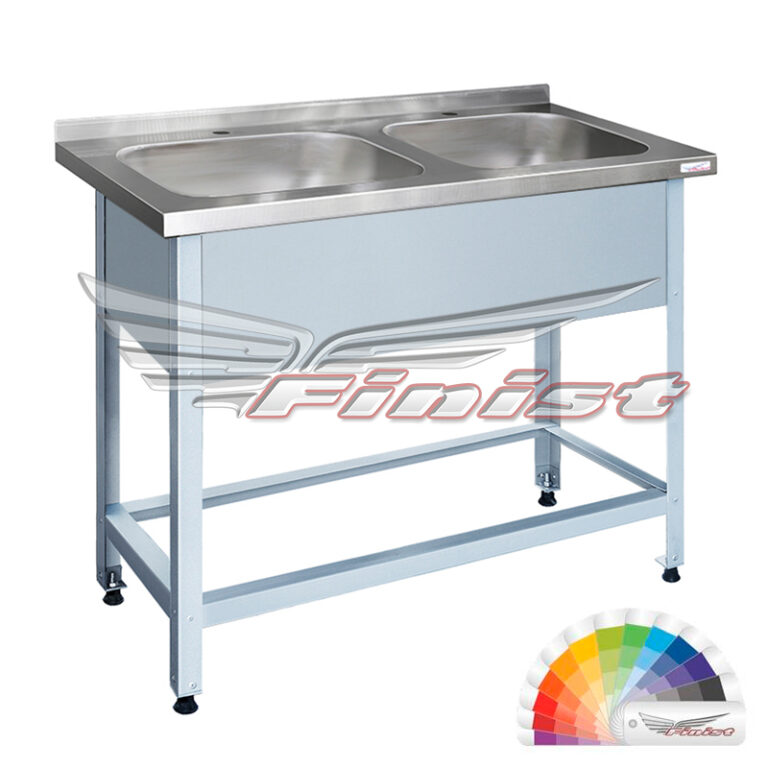 Ванна моечная с 2 цельнотянутыми мойками. Серия «Бюджет» ВМБц — каркас из уголка. Материал каркаса — труба с порошковым окрашиванием, фартук с 3-х сторон из стали с полимерно-порошковым покрытием. Каркас оснащен регулируемыми по высоте опорами для компенсации неровностей пола.