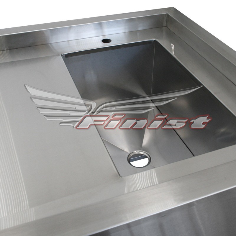 Над столешницей, слева, установлена трубка, в которую подается вода. Через небольшие отверстия в трубке вода непрерывно течет по столу, смывая все отходы в мойку, которая расположена справа. За счет герметичных бортов по периметру все, что используется на столешнице, остается внутри этих бортов.