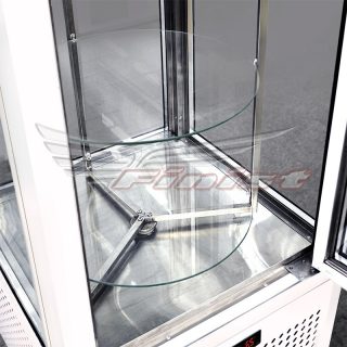 Во внутреннем объеме может быть 3,4 промежуточные полки для выкладки продукции. Внутри витрины установлена светодиодная лента, для эффектного освещения вашего товара. Четыре регулируемые ножки позволяют компенсировать неровности поверхности, на которую устанавливается витрина. Возможно добавление вращающихся полок.