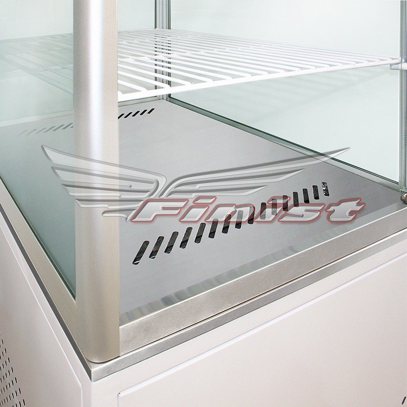 Во внутреннем объёме может быть две, три или четыре промежуточные полки для выкладки товара. Светодиодная подсветка. Четыре регулируемые ножки позволяют компенсировать неровности поверхности, на которую устанавливается витрина.