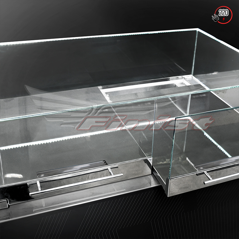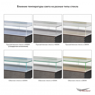 Корпус витрины имеет большую площадь остекления с 4 сторон. Задняя стенка витрины может быть выполнена из нержавеющей стали (стандартное исполнение — стекло).