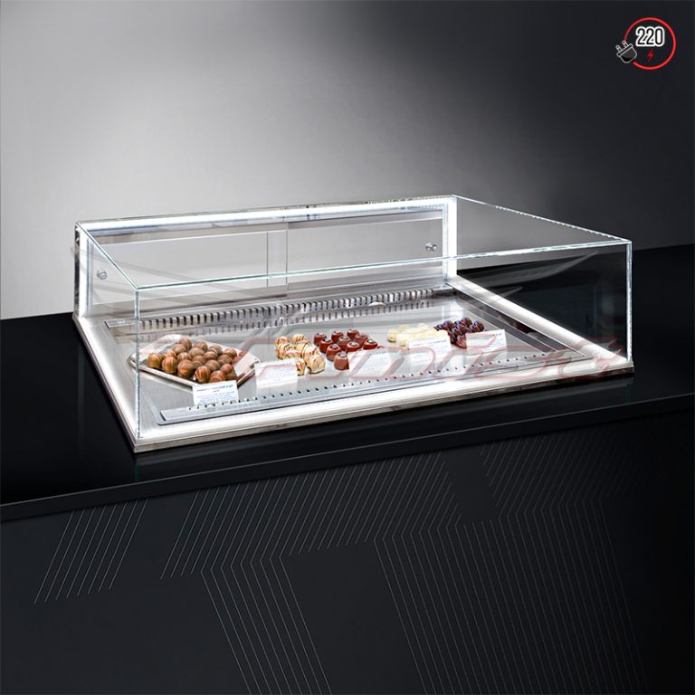 Данный вид витрин предназначен для экспозиции и кратковременного хранения шоколада, конфет и прочих небольших кондитерских изделий. Может монтироваться в столешницу из любого материала. Выкладка продуктов для демонстрации осуществляется на дно витрины. Стеклянный корпус витрины позволяет гостям разглядеть товар со всех сторон. Высота купола 220 мм идеально подходит для небольших изделий из шоколада или пралине.