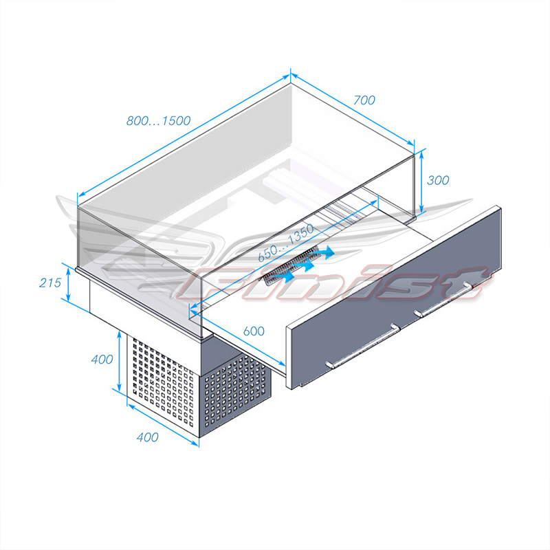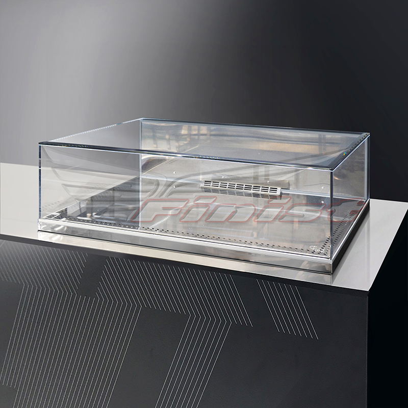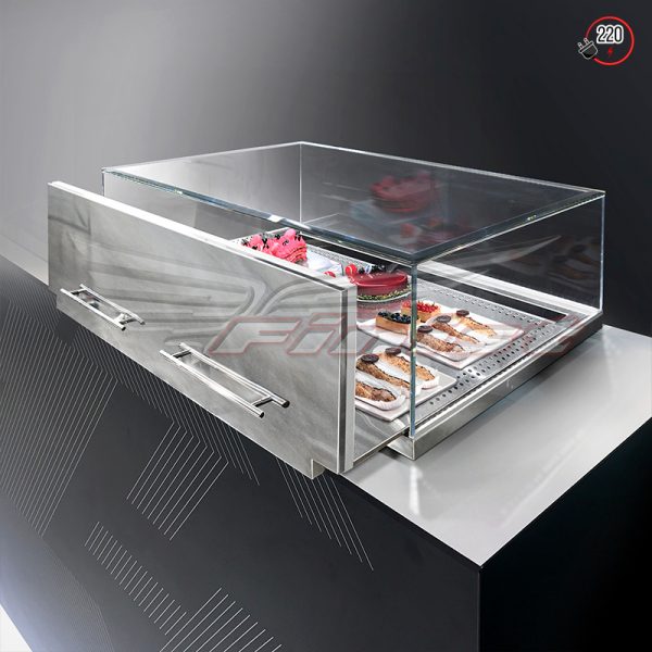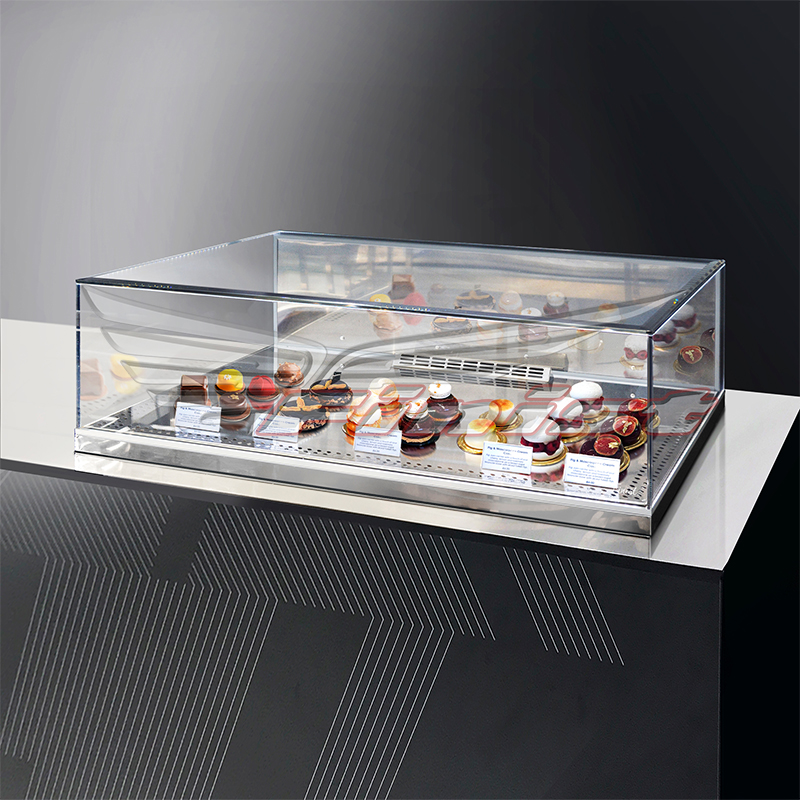 Данный вид витрин предназначен для экспозиции и кратковременного хранения десертов и кондитерских изделий. Может монтироваться в столешницу из любого материала. Выкладка продуктов для демонстрации осуществляется на выдвижной поддон. Корпус витрины имеет большую площадь остекления — с 4 сторон, что помогает гостям беспрепятственно окунуться в океан сладостей. Задняя стенка витрины может быть выполнена из высококачественной нержавеющей стали. Выдвижной поддон позволяет с лёгкостью доставать выбранные гостями блюда, без риска повредить стоящие по соседству или уронить ценник.