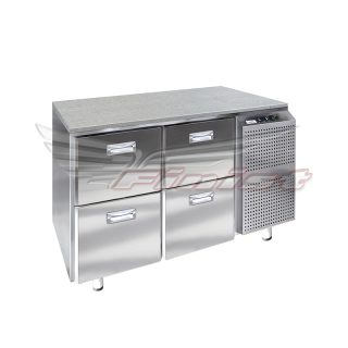Холодильный стол выполнен из высококачественной пищевой нержавеющей стали. Столы могут производиться (выпускаться) с распашными дверями (ящиками), которые имеют надежные петли (для ящиков направляющие) с опцией доводчиков, что обеспечивает гарантированное закрытие и поддержание заданной температуры в рабочем объеме стола. Используется электрический блок управления с функцией автоматической оттайки. Передняя панель моторного отсека имеет большую площадь перфорации, что позволяет обеспечить холодильному агрегату поступление воздуха для охлаждения.