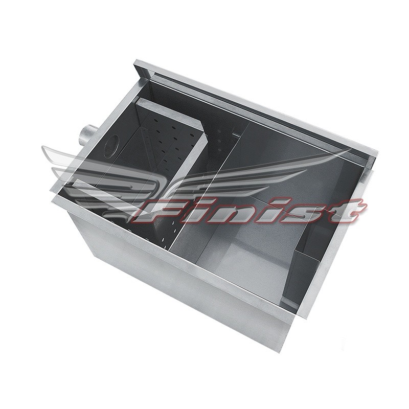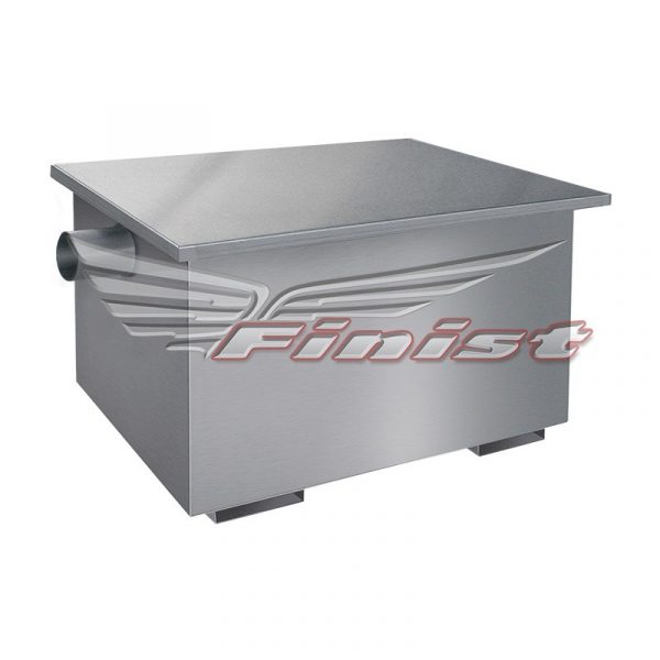 Перфорированный лоток для сбора крупных частиц съемный. Для обслуживания жироуловитель оборудован съемной крышкой, конструкция которой препятствует проникновению запахов наружу.